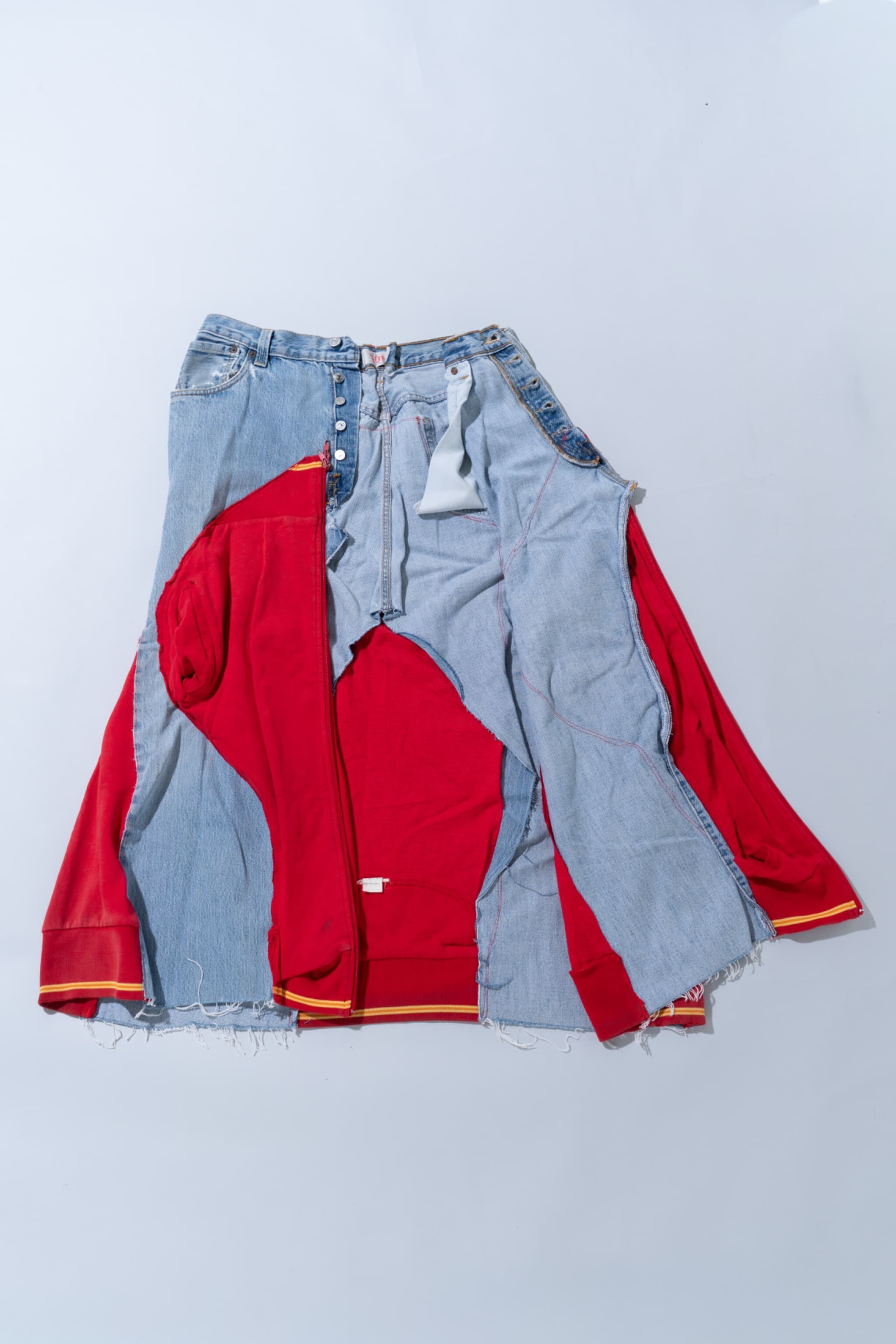オーナーが手掛けた、デニムとトラックジャケットのドッキングスカートです。前面が全開するギミック付きなので、様々なシルエットでファッションを楽しむことが出来ます。